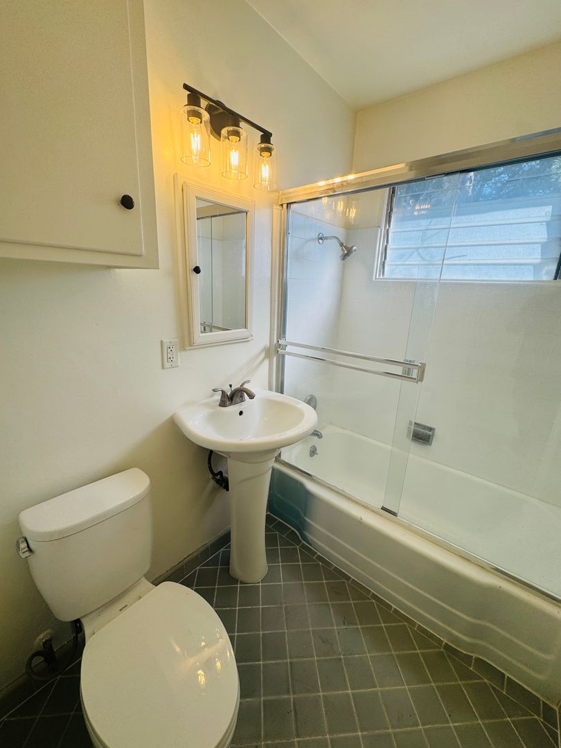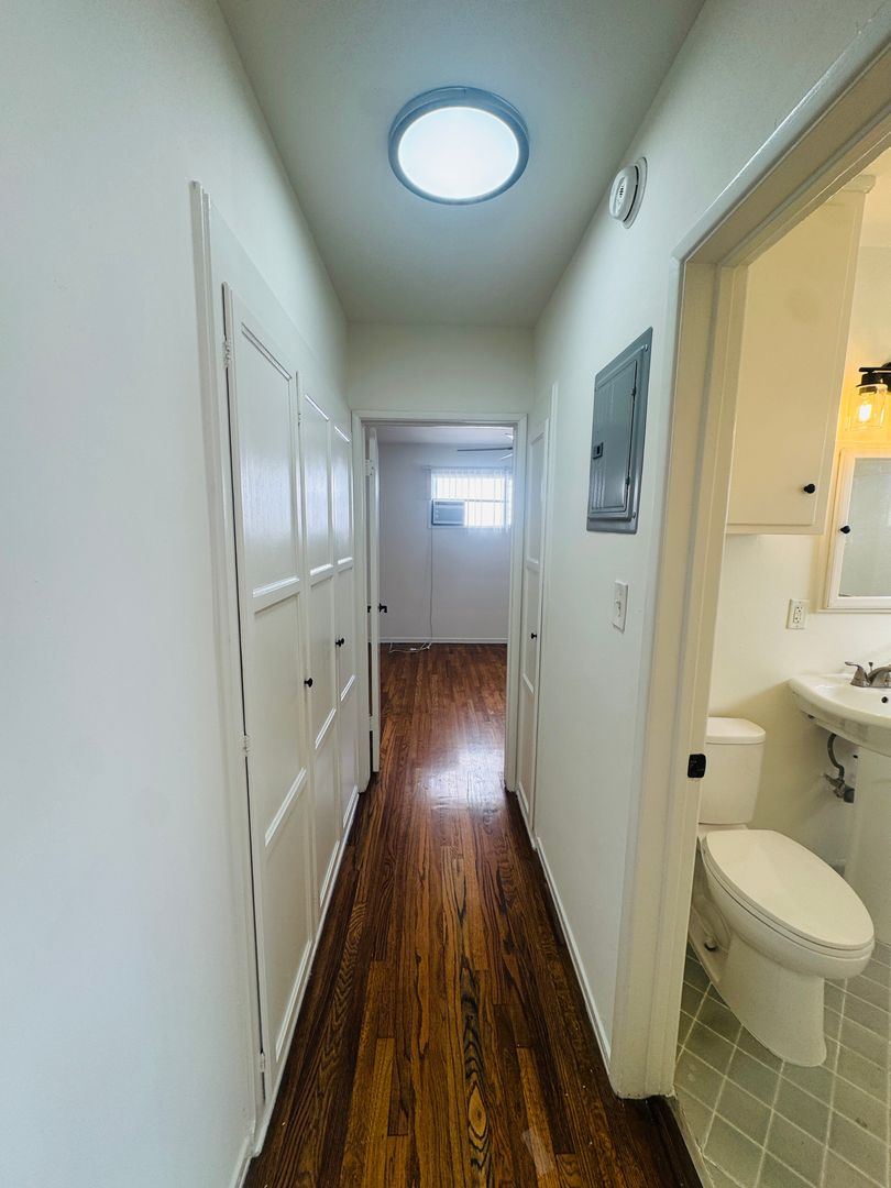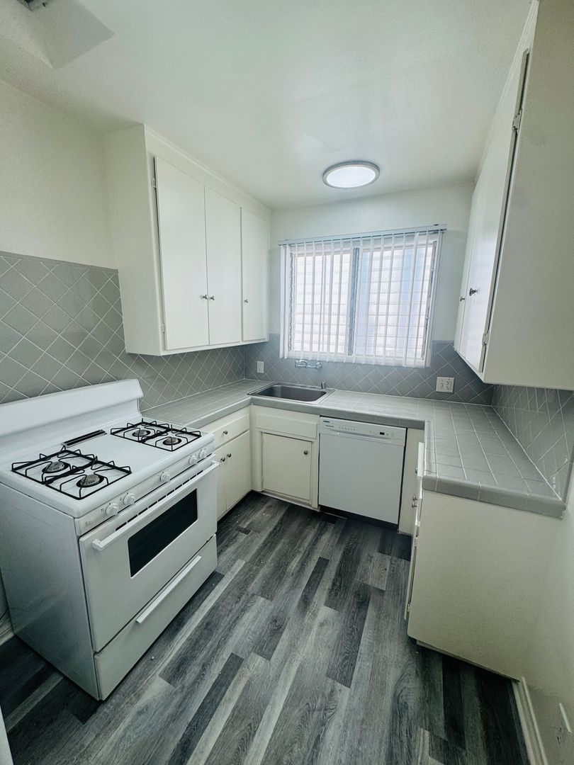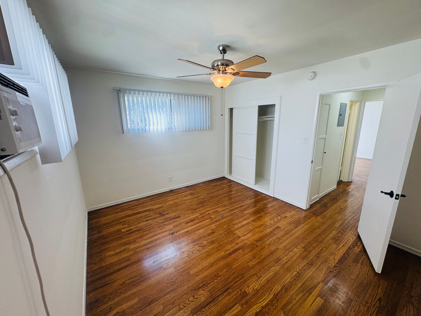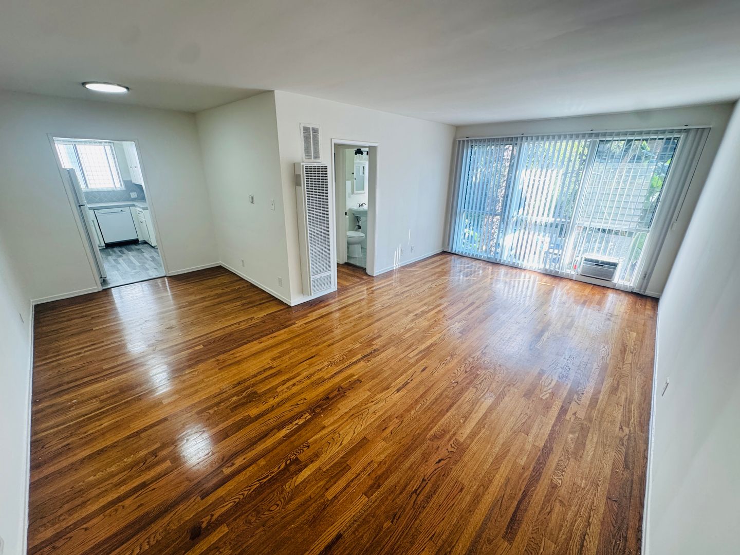 CUTE upstairs one bedroom one bathroom apartment in Hollywood with hardwood floors, tiled kitchen and bathroom, stove/fridge, DISHWASHER, ceiling fan in the bedroom, and Window AC units. This 36 unit building has a secured entry, onsite manager, pool, and is nestled near Runyon, WeHo, Downtown, Silverlake, and much more! Parking available for an additional $100 per month.