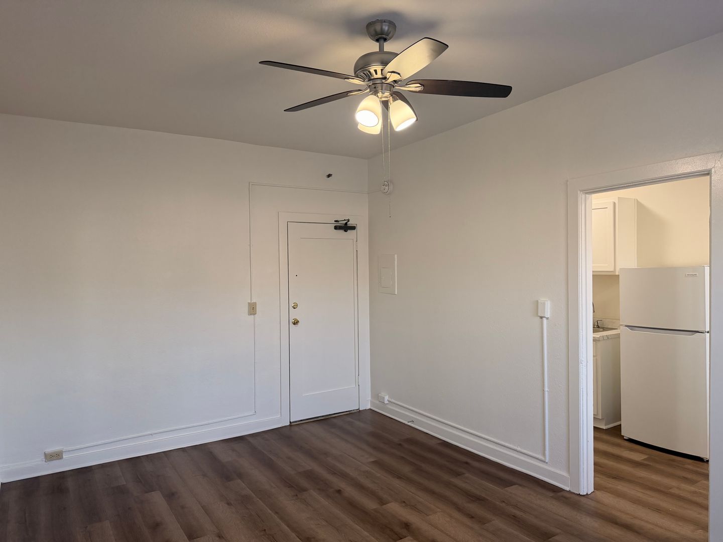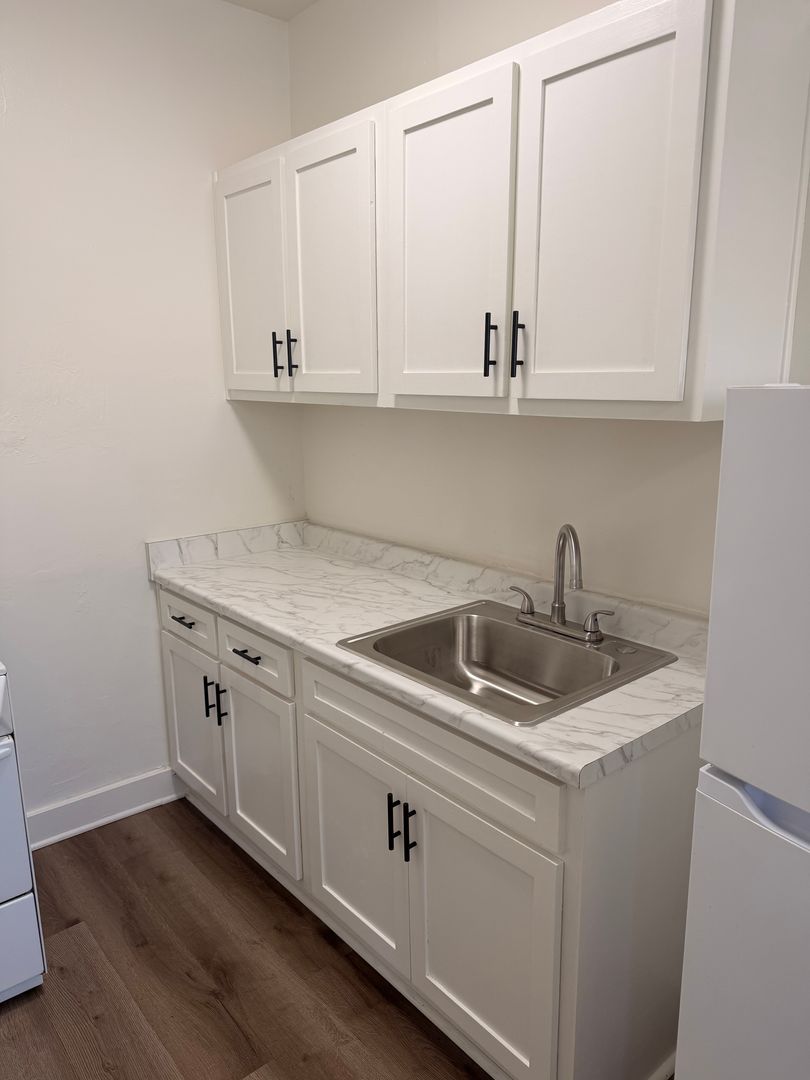 The unit features vinyl plank flooring throughout and a functional kitchen with updated countertops, sink, and cabinetry, along with a stove, refrigerator, and a dedicated dining area. You’ll also enjoy a spacious walk-in closet and a full bathroom.